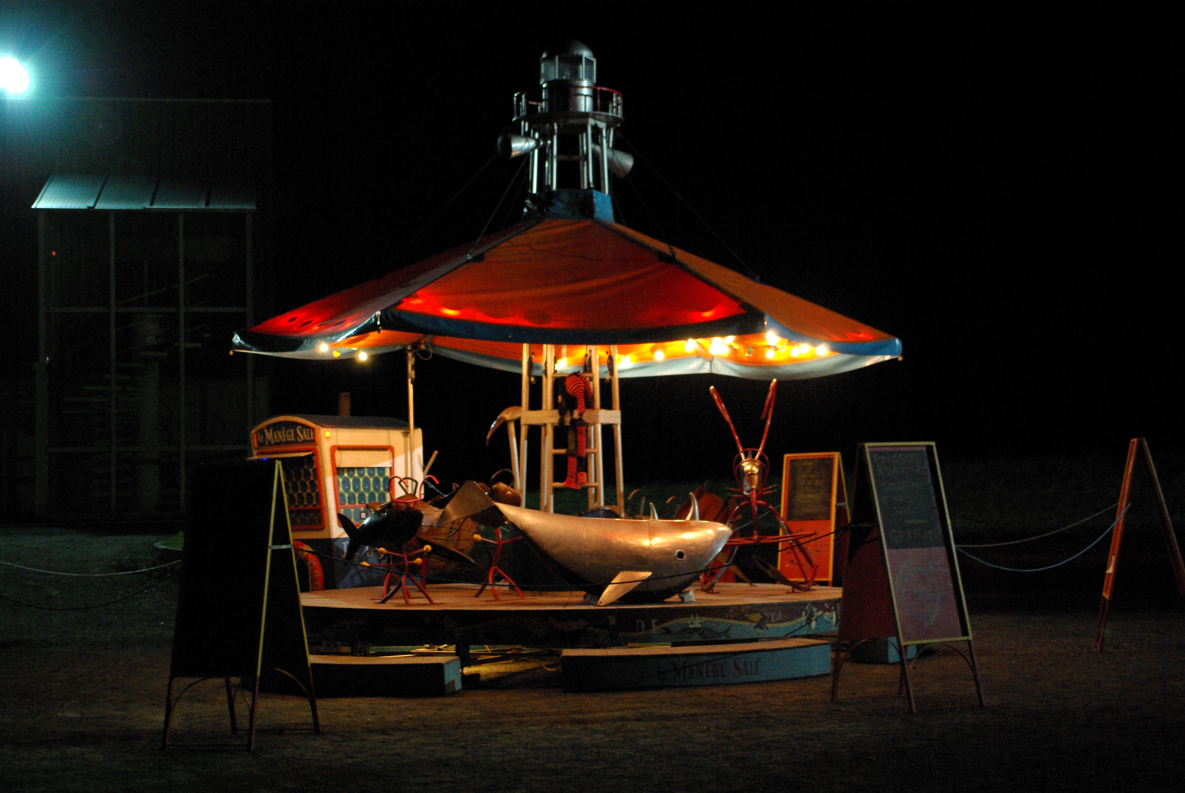 Le Manège Salé est un petit carrousel atypique et poétique, peuplé de huit animaux marins en tôle, acier, aluminium et bois. Huit bestioles tout droit sorties de fonds marins imaginaires, qui emportent à chaque tour une douzaine de passagers dans une ronde ludique et festive. Le Manège Salé cultive l’art de tourner en rond et de prendre son temps… dans un monde qui va décidément trop vite, non ?