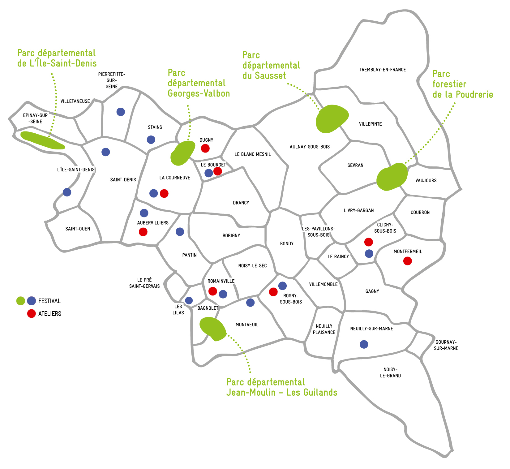 Le festival se déroule aussi à L’Ile-Saint-Denis, Les Lilas, Montreuil, Neuilly-sur-Marne, Pantin, Pierrefitte-sur-Seine, Saint-Denis, Stains et dans cinq parcs départementaux (Jean-Moulin – Les Guilands, Georges-Valbon, La Poudrerie, L’Ile-Saint-Denis et Le Sausset).