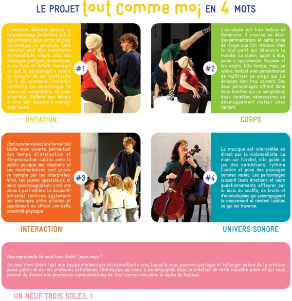 Dans ce spectacle à la fois drôle et poétique, une clown maladroite et un acrobate pétillant se rencontrent au son du violoncelle. Ici, pas de mots, mais des corps qui se découvrent, s’observent et s’imitent joyeusement dans un subtil jeu de miroir déformant. Au rythme de la musique, tous les deux prennent le temps de s’apprivoiser, de s’accorder. Une ode à l’écoute et au partage pour les plus petits !