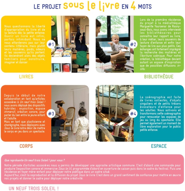 S’endormir sur une pile de livres, tapoter à la machine à écrire. À quatre pattes sur les encyclopédies, faire des châteaux de livres. Danser dans les pages. Deux artistes vous accueillent dans cette installation avec plus de 500 livres comme une matière à danser et à jouer ensemble. Chacun·e est aussi invité·e à partager ses premiers souvenirs de livres et d’histoires pour suspendre le temps.