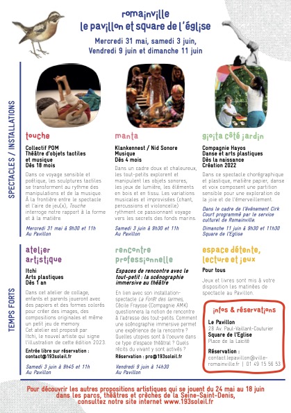 Pendant le festival, Le Pavillon de Romainville (QG de l'association) se transforme en un petit îlot de fête mettant à l'honneur les enfants, l'art et la nature ! Pendant 4 jours, découvrez des spectacles, réalisez un atelier avec Itchi - l'artiste qui signe l'illustration de cette édition 2023 et participez à une rencontre professionnelle.