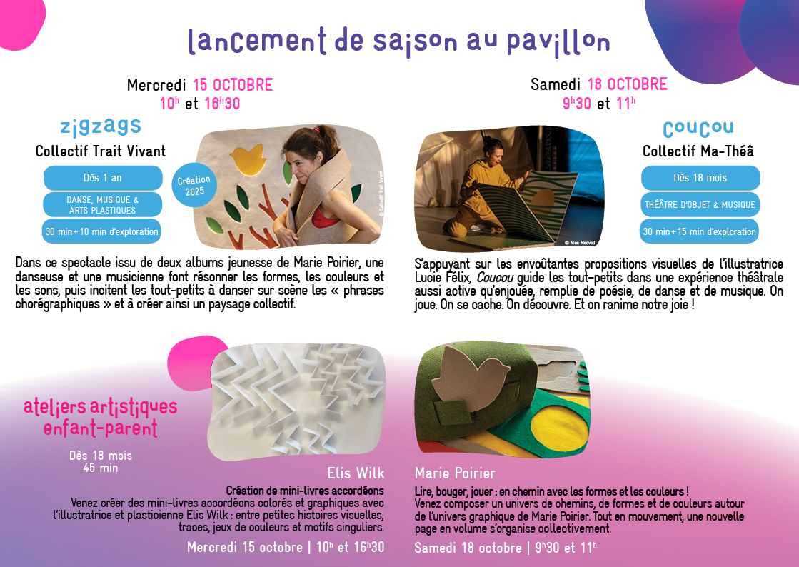 Notez bien les dates de notre lancement de saison : les 15 et 18 octobre 2025 ! Nous vous attendons nombreux·ses au Pavillon de Romainville pour ces deux journées placées sous le signe du livre et des illustrations jeunesse. Au programme, les spectacles Zigzags du Collectif Trait Vivant et Coucou du Collectif Ma-Théâ, qui sont tous deux inspirés d'albums jeunesse ; ainsi que deux ateliers artistiques enfant-parent autour de la lecture et de la création de livres graphiques.